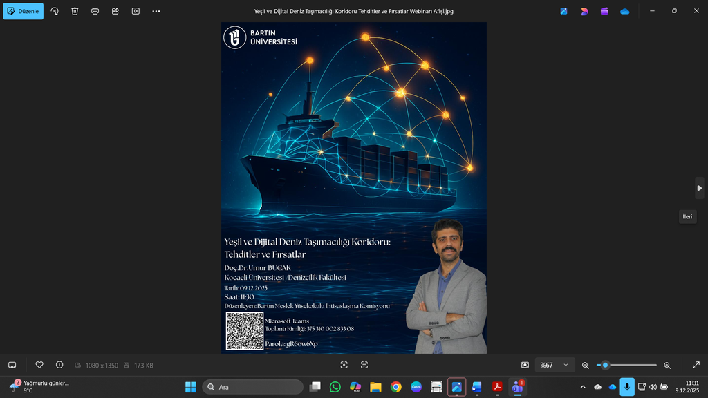 Bartın Üniversitesi (BARÜ) Bartın Meslek Yüksekokulu İhtisaslaşma ve Proje Destek Komisyonu tarafından “Yeşil ve Dijital Deniz Taşımacılığı Koridoru: Tehditler ve Fırsatlar” konulu bir webinar gerçekleştirildi. Öğr. Gör. İrem BEBEK’in açılış konuşmasıyla başlayan etkinlik, deniz işletmeciliği alanında uzman konuk akademisyen ile öğrencileri ve öğretim elemanlarını bir araya getirdi.