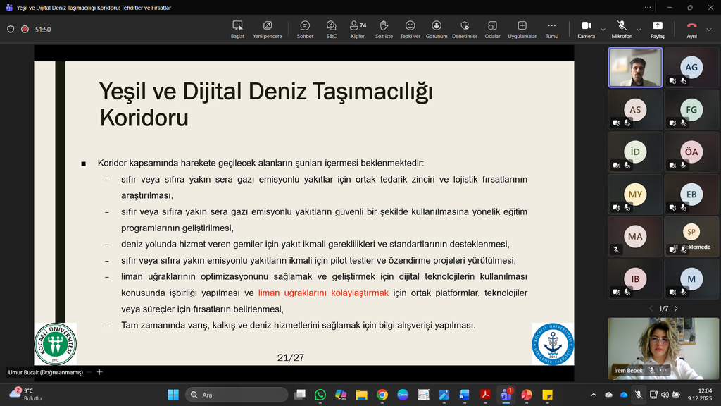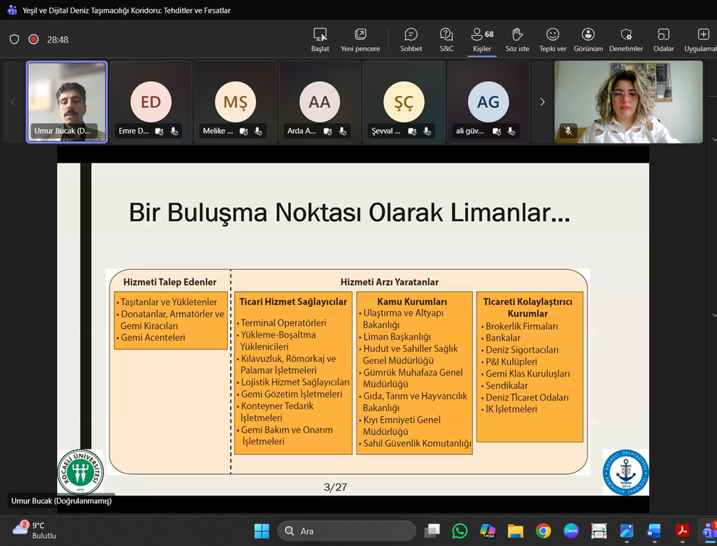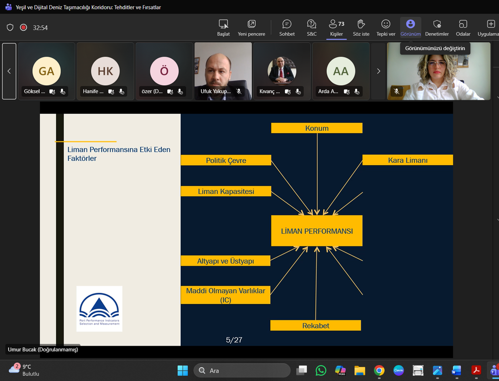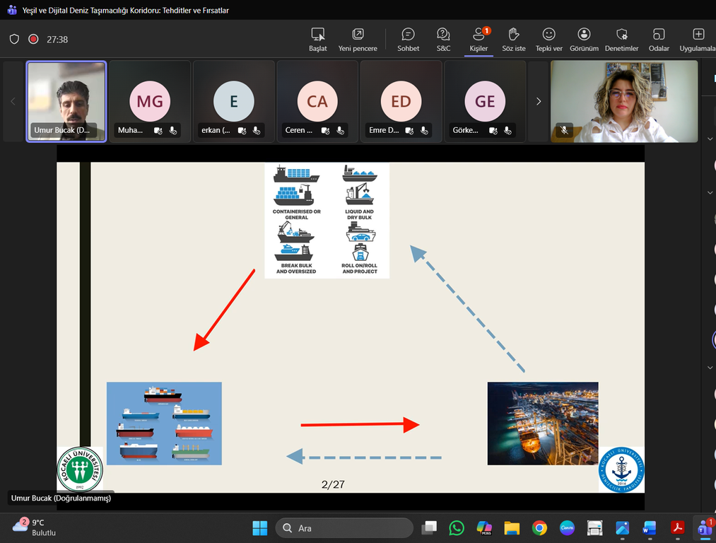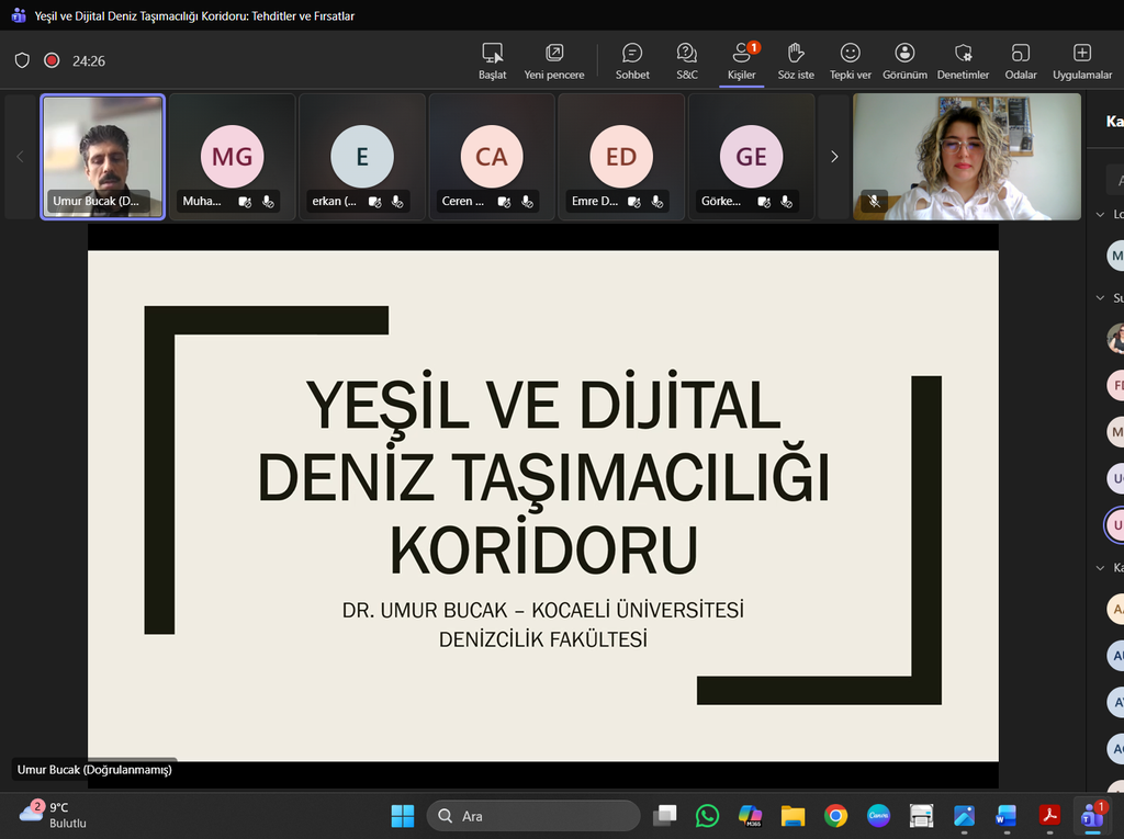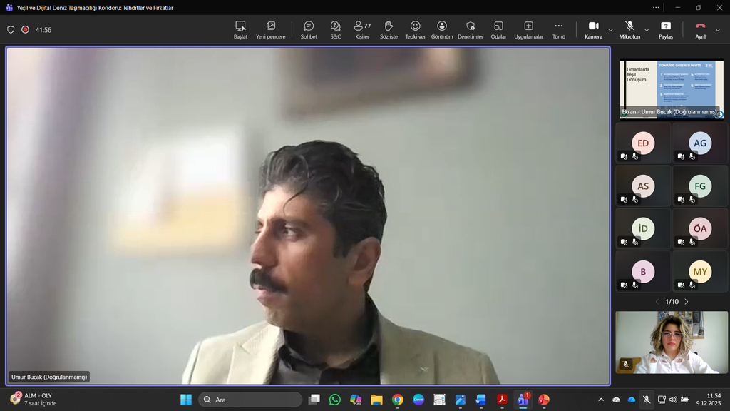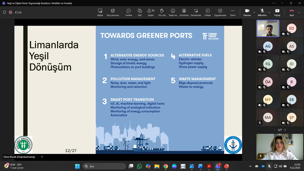 Microsoft Teams üzerinden çevrim içi olarak yapılan etkinlikte, yeşil ve dijital deniz taşımacılığı koridorlarının ortaya çıkardığı fırsatlar, riskler ve sektörel etkiler kapsamlı biçimde ele alındı. Webinarın davetli konuşmacısı, Kocaeli Üniversitesi Denizcilik Fakültesi Denizcilik İşletmeleri Yönetimi Bölümü öğretim üyesi Doç. Dr. Umur BUCAK, limanlarda yeşil dönüşümün stratejik önemi, bu dönüşümün sektör ve bölgesel gelişim üzerindeki olumlu etkileri ile dijitalleşmenin operasyonel süreçlere sağladığı avantajlar hakkında değerlendirmelerde bulundu. Ayrıca, oluşmakta olan yeşil ve dijital taşımacılık koridorlarının hangi alanlarda harekete geçirici etki yaratabileceği ve bu süreçte karşılaşılabilecek potansiyel tehdit ve fırsatlar ayrıntılı biçimde ele alındı.