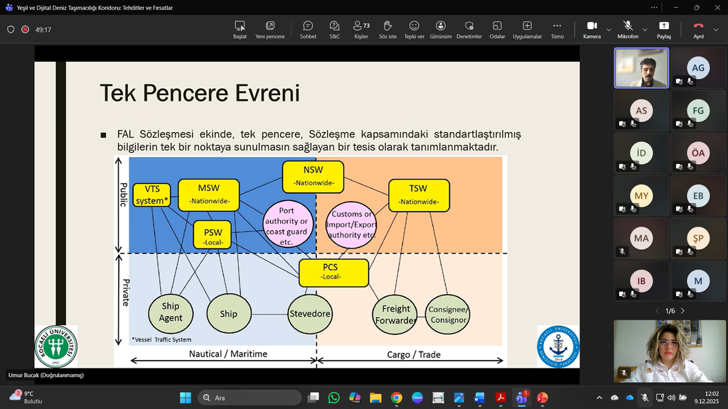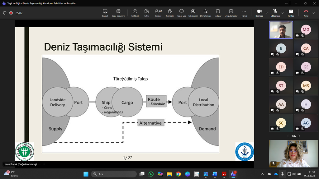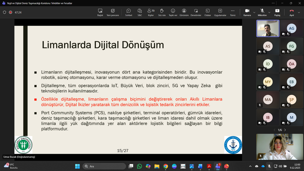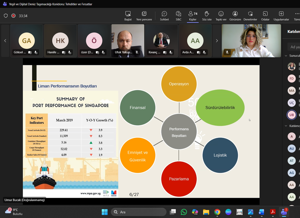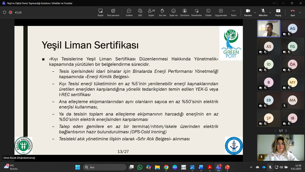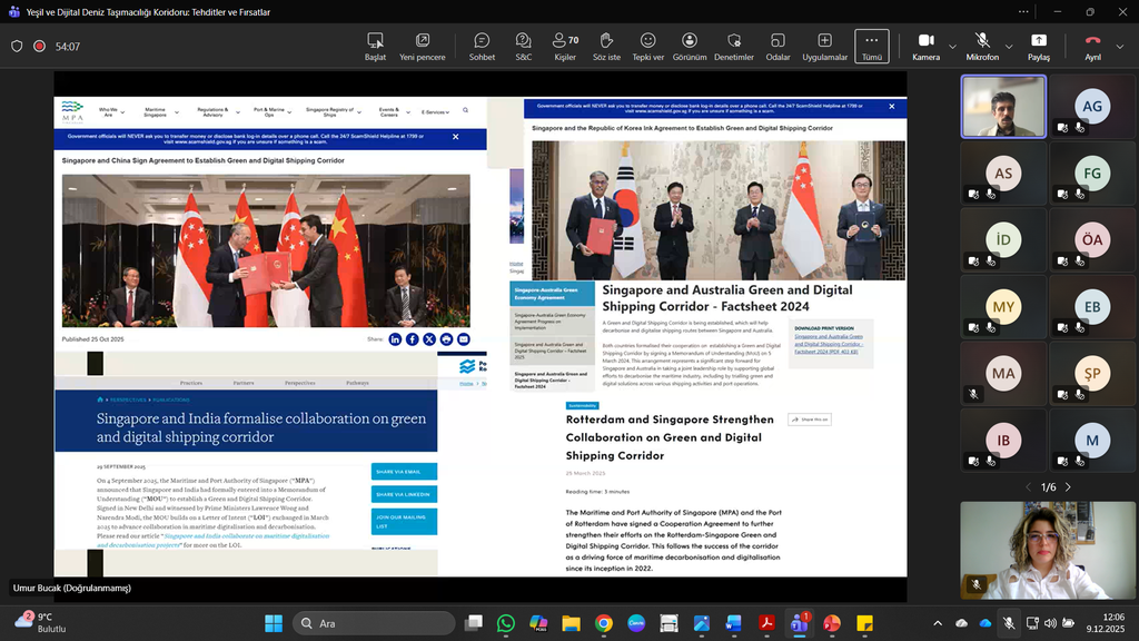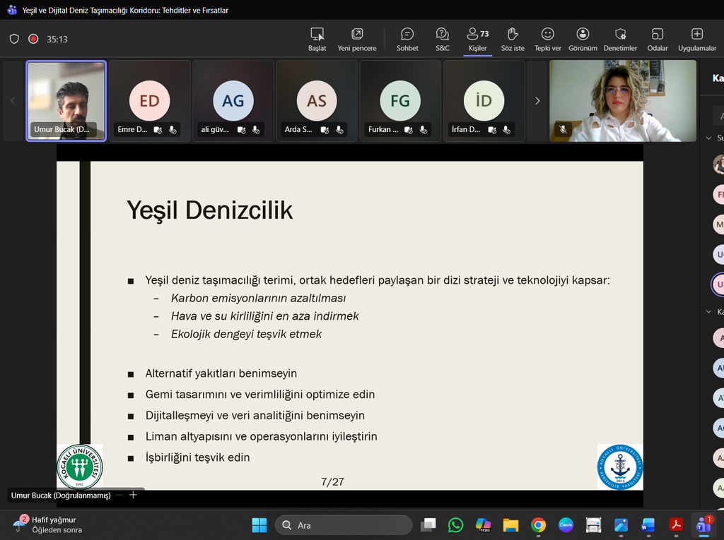 Microsoft Teams üzerinden çevrim içi olarak yapılan etkinlikte, yeşil ve dijital deniz taşımacılığı koridorlarının ortaya çıkardığı fırsatlar, riskler ve sektörel etkiler kapsamlı biçimde ele alındı. Webinarın davetli konuşmacısı, Kocaeli Üniversitesi Denizcilik Fakültesi Denizcilik İşletmeleri Yönetimi Bölümü öğretim üyesi Doç. Dr. Umur BUCAK, limanlarda yeşil dönüşümün stratejik önemi, bu dönüşümün sektör ve bölgesel gelişim üzerindeki olumlu etkileri ile dijitalleşmenin operasyonel süreçlere sağladığı avantajlar hakkında değerlendirmelerde bulundu. Ayrıca, oluşmakta olan yeşil ve dijital taşımacılık koridorlarının hangi alanlarda harekete geçirici etki yaratabileceği ve bu süreçte karşılaşılabilecek potansiyel tehdit ve fırsatlar ayrıntılı biçimde ele alındı.
